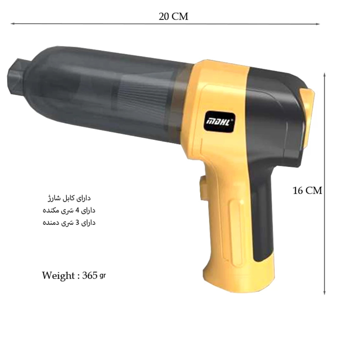 مدت زمان لازم برای شارژ شدن جارو 3-4 ساعت است و در هنگام شارژ کامل می توانید از آن به مدت 20 دقیقه استفاده بفرمایید که این مدت زمان عملکرد برای جارو های شارژی سایز کوچک بسیار مناسب است . متعلقات جارو شارژی چندمنظوره برند mdhl عبارتند از محفظه جمع آوری زباله، فیلتر HEPA، نازل باریک، نازل برس،نازل پهن ، 3 عدد نازل دمنده و کابل شارژ. لطفا توجه بفرمایید که رنگ محصول مانند عکس اول زرد است .